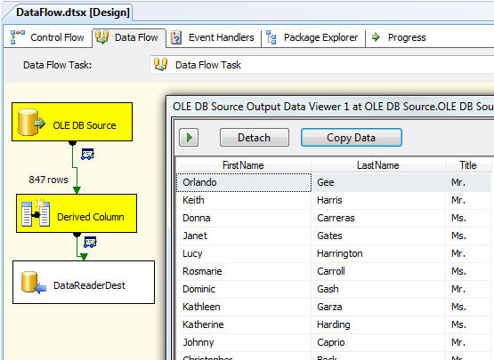 Now use the same steps to add a Dataviewer between the Derived Column and the destination using the same steps.