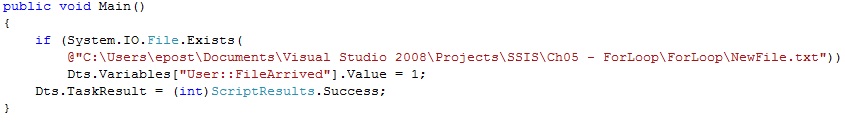 In this example, I’ll illustrate how to use a For Loop container to wrap a Scrip Task object which iteratively monitors the file system for the presence of a file and once found, uses another Script Task object to notify the user.