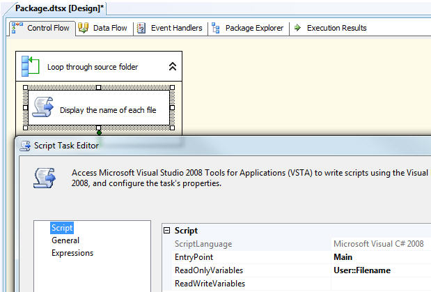 In this example, I’ll illustrate the use of a package-level variable being shared between ForEach Loop Container and Script Task Control Flow tasks.