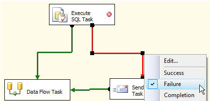 Drag new constraints between the Execute SQL task, Send Mail task, and the Data Flow task.