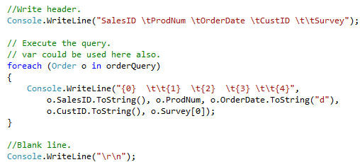 Using Microsoft’s new elegant syntax or subset of the .NET framework that looks like it might be replacing ADO.NET, I will illustrate how to perform a simple query.