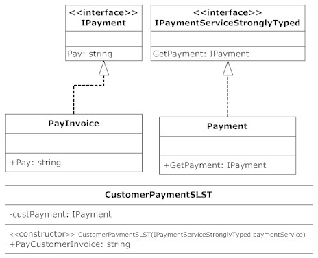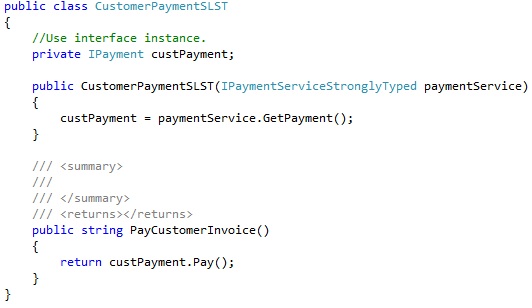 The first thing you’ll notice that when compared its prior version, instead of containing an IPayment object (dependency), the constructor now receives an interface object – IPaymentServiceStronglyTyped.