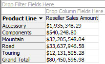 Out of the Reseller Sales Amount, I wish to see break down by product line. Therefore, under the Product dimension, I’ll drag the Product Line hierarchy onto the “Row” area. Now I have the sales amounts displayed by product line.