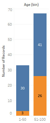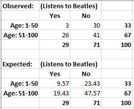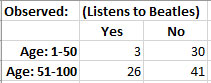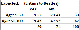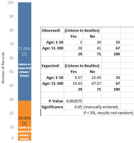 As you can see in the previous sample (100 records of 10,000), for the two Age groups (bin) of 1-50, and 51-100, the latter (older) age groups contains far more people who listen to The Beatles.