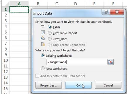 When the Import Data window appears, place your cursor in the upper-left cell of the sheet where you want the data, ensure the following selections, OK.