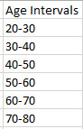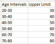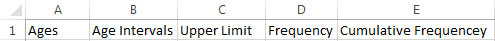 Next, I’ll add to my spreadsheet the following columns: Age Intervals to denote the lower and upper bounds of each age interval I wish to study, Upper Limit to denote the largest value within each interval, Frequency to contain how often ages within each interval occurs, and Cumulative Frequency to determine when compared to all previous intervals, how often each occurs.