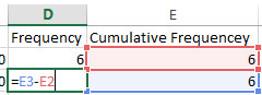 Now I’ll populate my Frequency column by beginning with the first value in Cumulative Frequency, then subtracting each subsequent frequency from the previous value for all frequencies.