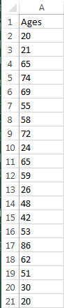 Next, I’ll add to my spreadsheet the following columns: Age Intervals to denote the lower and upper bounds of each age interval I wish to study, Upper Limit to denote the largest value within each interval, Frequency to contain how often ages within each interval occurs, and Cumulative Frequency to determine when compared to all previous intervals, how often each occurs.