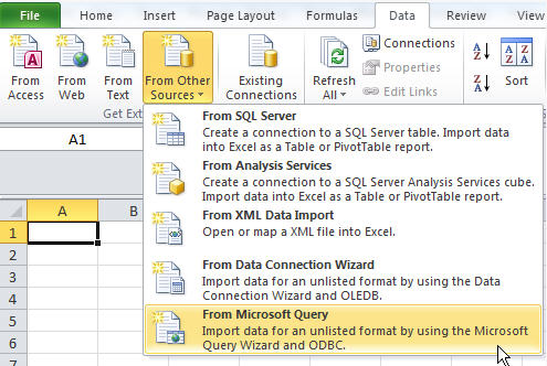 First, I’ll open Excel and create a new connection “From Microsoft Query.”