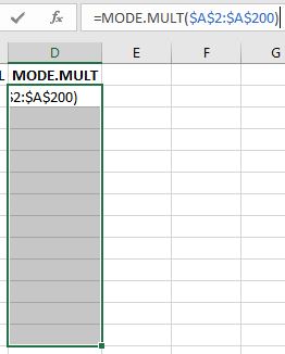 Then, in the formula bar I’ll enter “=MODE.MULT()” and the range.