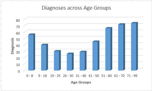 This data set reveals a spike of cancer rates among the youngest in the sample, which subside as the age groups increase, then spike again during the older years.