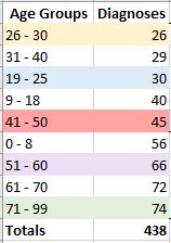 First, I will begin with a data set showing disease diagnoses attached to various age groups.