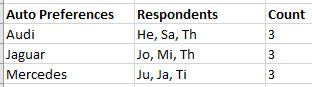 Though this data set is simple enough to visually inspect for those who selected more than one choice (intersection), I create a new table which displays their Auto Preferences more clearly so its easier to distinguish where an intersection occurs.