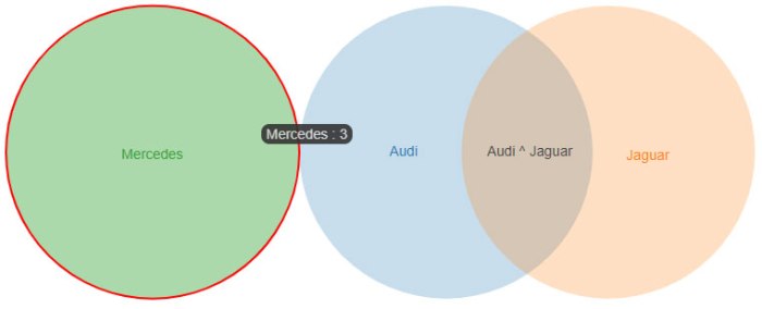 The first circle is separate, indicating no people who chose Mercedes also chose either of the other two automakers – Audi and Jaguar.