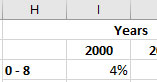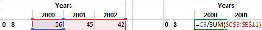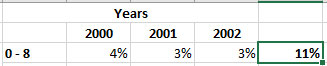 Now that I have the first percentage for the age group 0-8 for the year 2000, I’ll duplicate the formula to the adjacent cells, then create a row total.