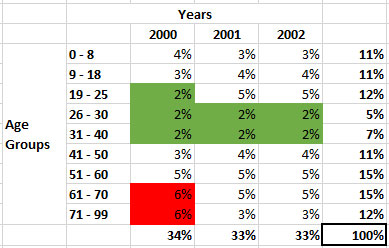 With both (joint) distributions (Age Groups and Years), I can now easily see the highest percentage of disease diagnoses occurred for the two oldest age groups, in the year 2000, and the least percentage of diagnoses occurred for all three years between age groups of 26-30 and 31-40, with the age group of 19-25 only in the year 2000.