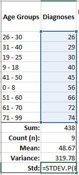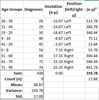 Also, notice the standard deviation (Std – 17.88) is the same value as what I produced by using the total under the variance column, and squaring it.