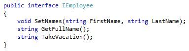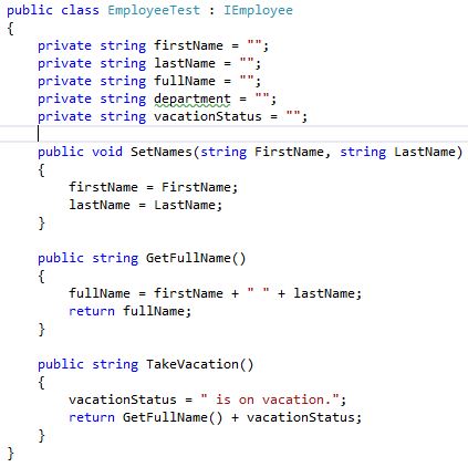 To use this class as a template for employee of different types (Supervisor), I’ll create a new interface for this class to inherit different types of behavior as needed.