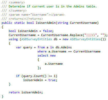 The IsUserAdmin() function receives the user’s identity, strips the domain, then uses a Linq query to test the user’s identity in the Admins table.