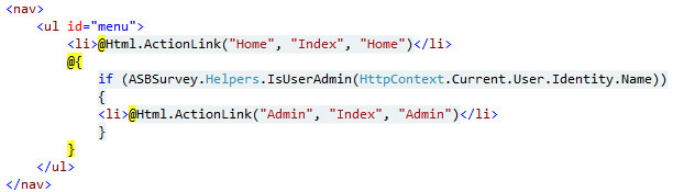 As you can see in my View’s HTML, I am displaying a “Home” link and then, if the current user is part of the Administrator role, display a link to the “Admin” page, calling the default (Index) function for that controller. If the user’s current identity does not pass the test, nothing occurs.