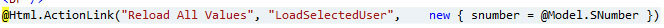 Next, I provide an ActionLink() statement with text for the link (“Reload All Values”), the name of the controller function to call (“LoadSelectedUser”), and finally, pass to the ActionLink() statement the SNumber property of the model.
