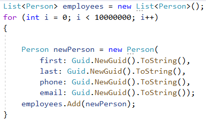 First, I’ll setup a loop which instantiates 10,000,000 Person objects using named parameters.