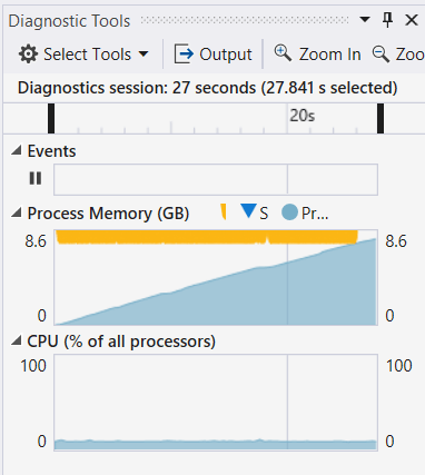 Now I’ll invoke the Diagnostic tools (Debug -> Windows -> Show Diagnostic tools) and run my app to see memory utilization.