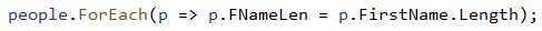 Now, I’ll call ForEach() on each person object, assigning the length of FirstName to the FNameLen property of each person object.