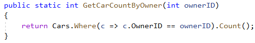 In this method, I’m using the LINQ Where() method to isolate those car objects that below to the owner (userID) passed into the method. Then, I’m calling Count() to return that person’s number of cars they own.