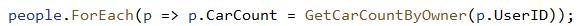 Using the method syntax for LINQ, I can now perform another set operation to update each person’s CarCount property by calling my custom GetCarCountByOwner() method.