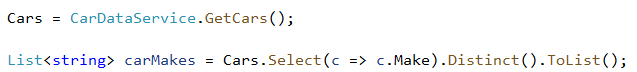 In this article I’ll demonstrate how to use Distinct() during Select() to generate a unique list of car makes.