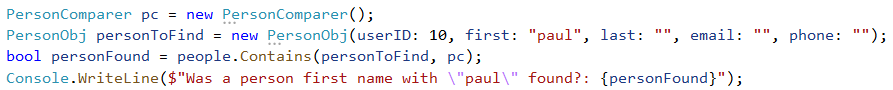 Now I’ll instantiate my new PersonComparer class and a Person object to find in my collection.
