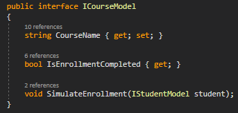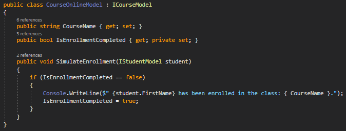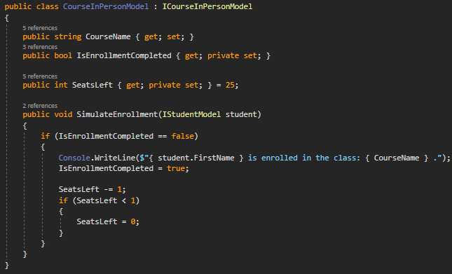 As you can see, the class implements the contract and provides the details of how to enroll a student as well as reporting.