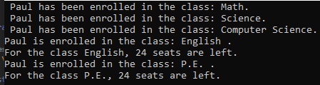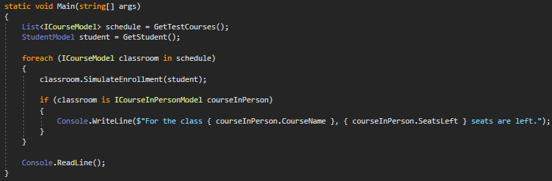 Similarly, when iterating through the schedule of classes and simulating enrollment of each class, notice the loop doesn’t care whether or not the course is online or in-person. Also, this allows for future course types (hybrid) to be added, allowing for further customization of a course without requiring any changes to this code.