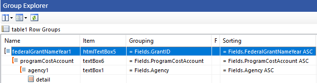 As you can see, I have three hierarchies or level of data by which I wish to group to avoid repeating duplicate data for the last three columns: grant, PCA, and agency.